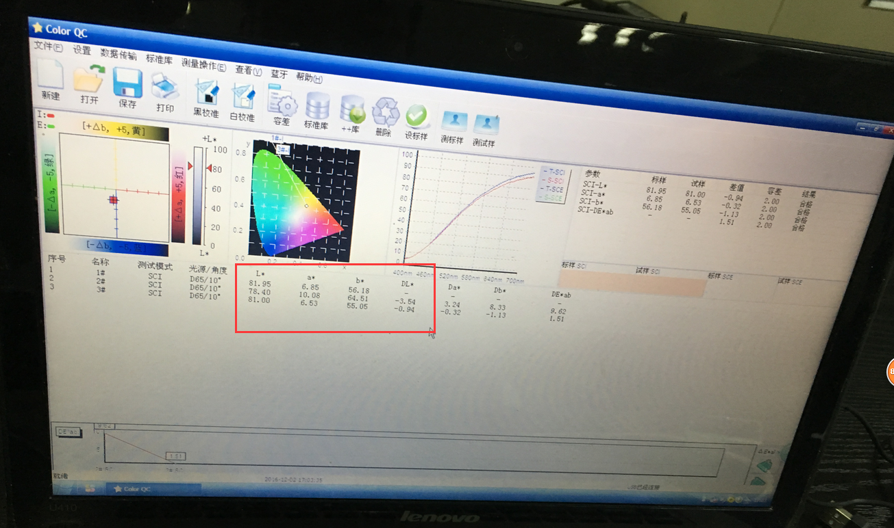三份样品,通过啤酒色度仪测出来颜色曲线一致。最后用CS-820测出数据,能测出L、a、b值的细微差别。